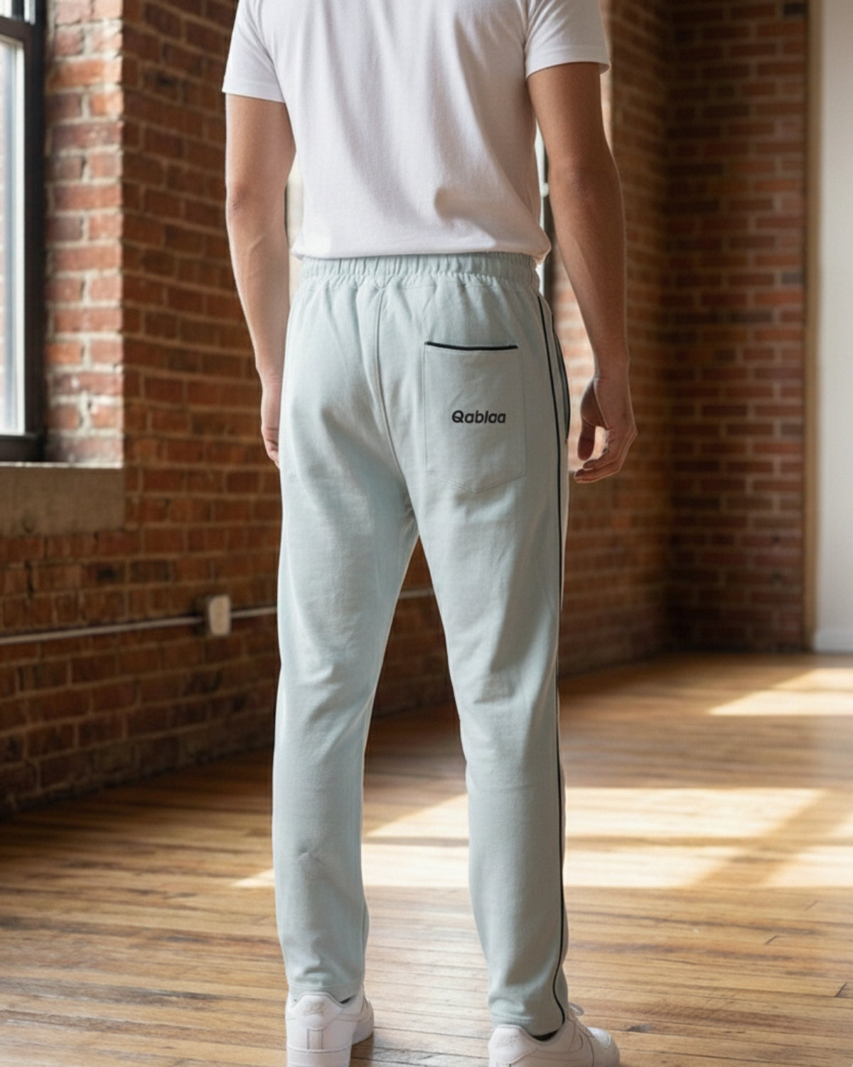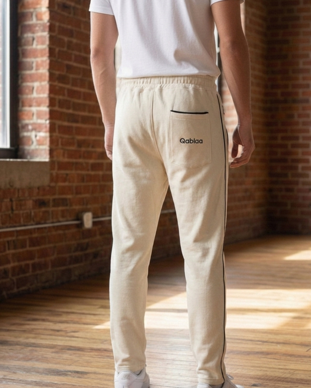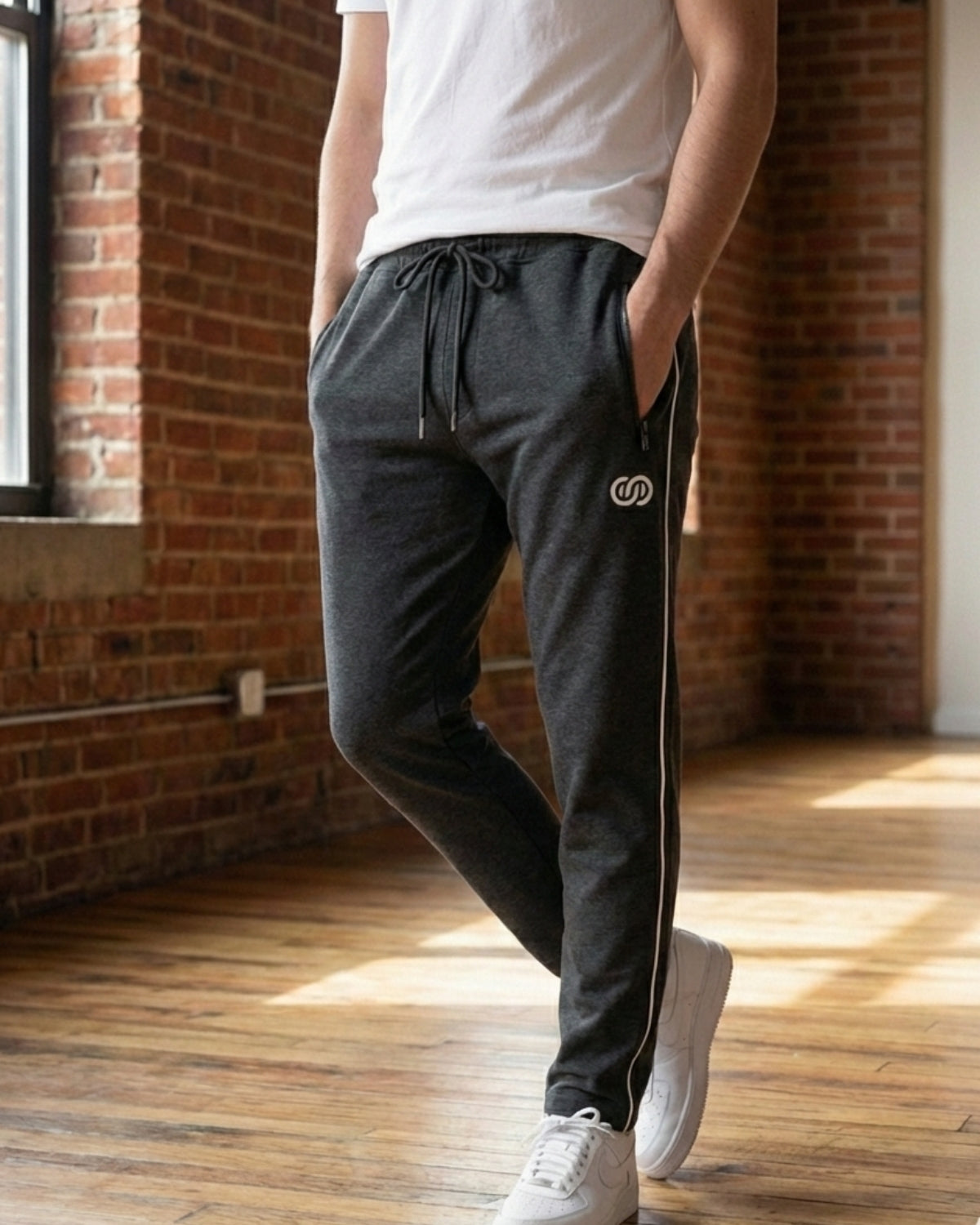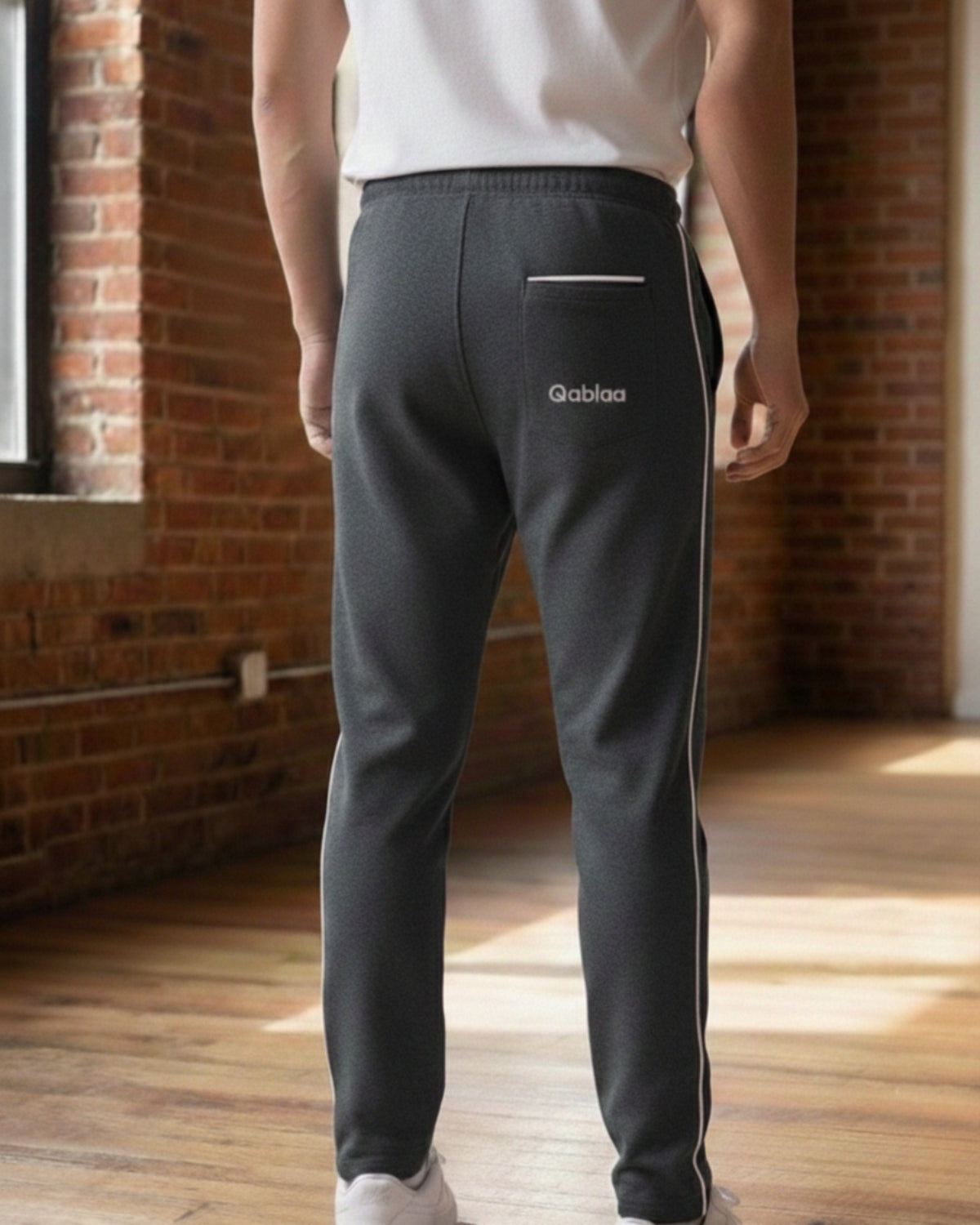 Style: Elevated Casual Minimalism. Featuring a sharp, monochromatic design accented by a high-contrast side stripe, these trousers offer a polished look that bridges the gap between leisure and style. The unembellished back and tailored finish provide a sophisticated aesthetic that pairs easily with a basic tee or a crisp linen shirt.